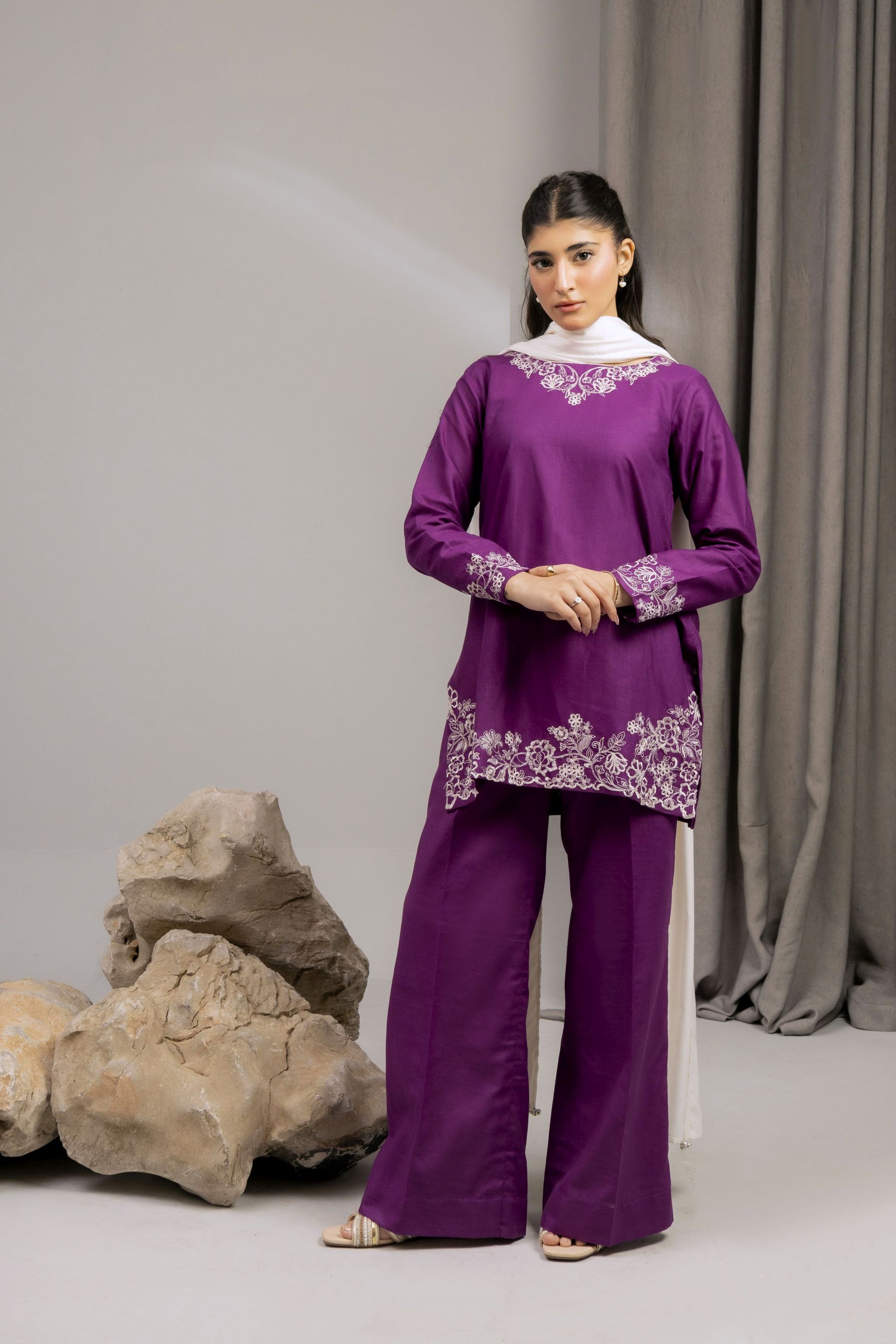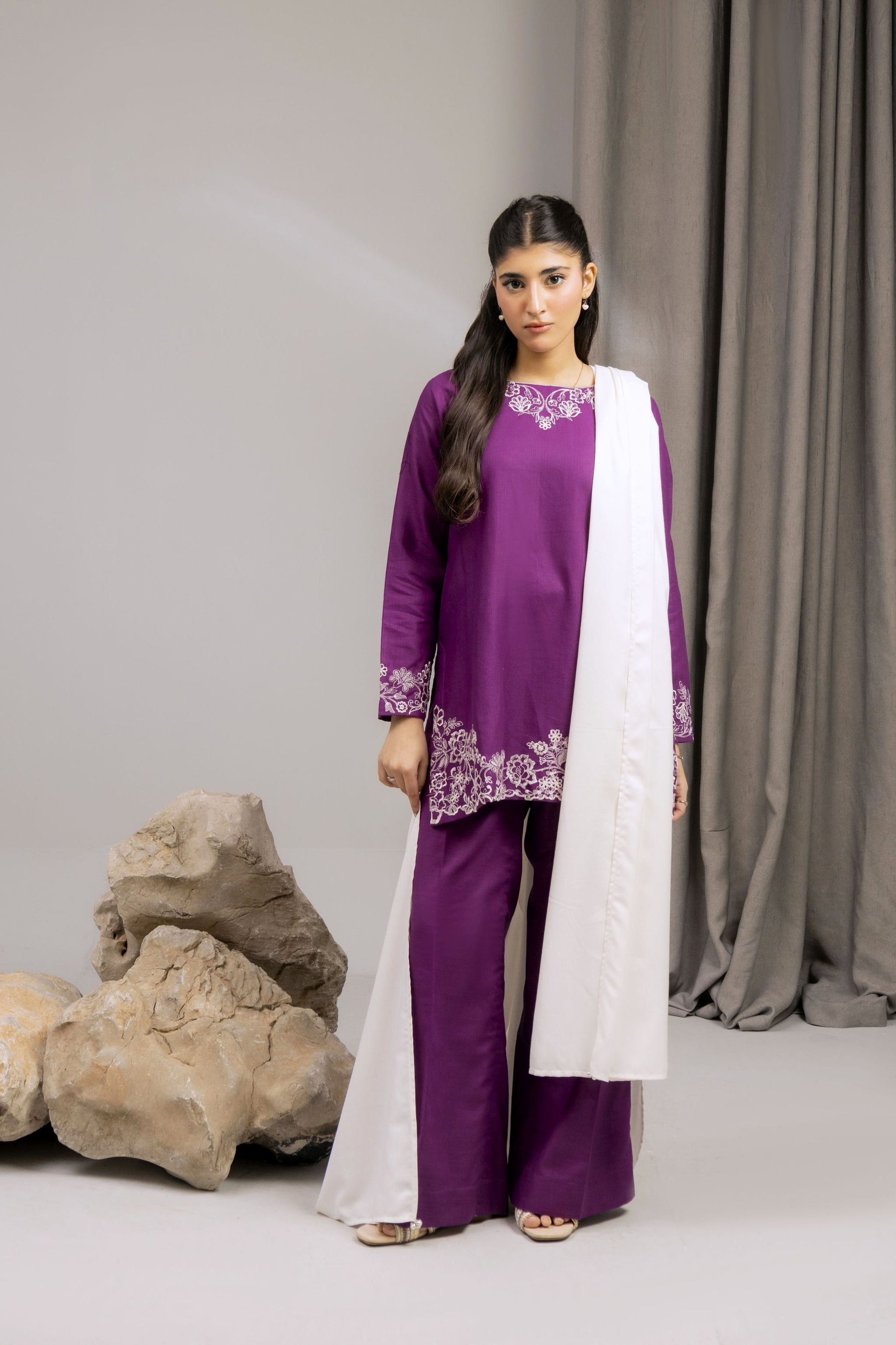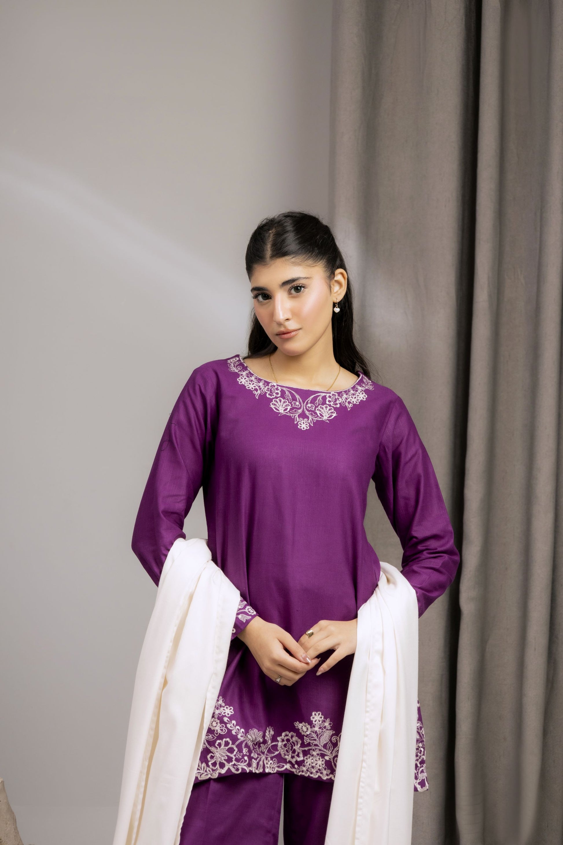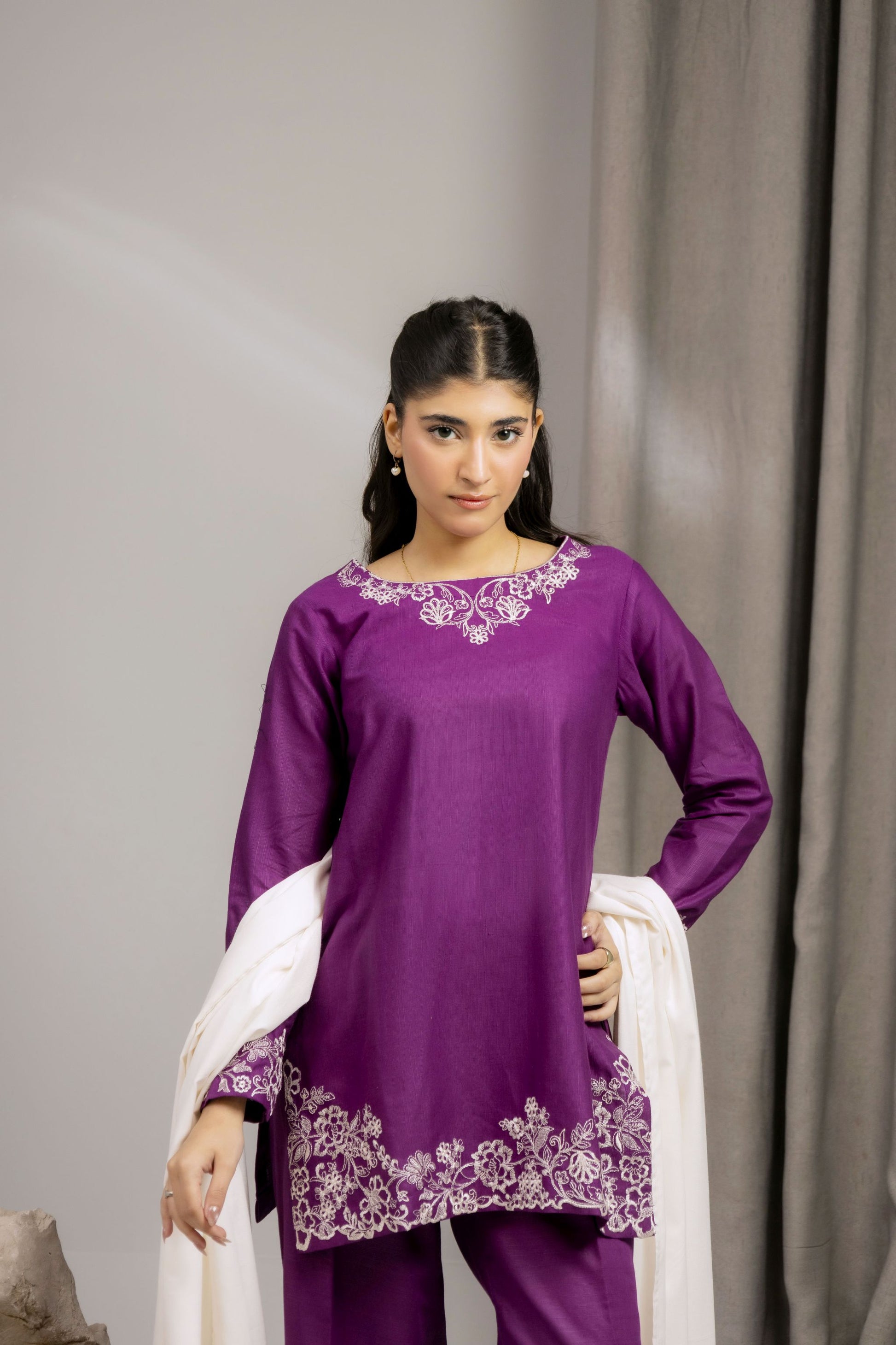 Amara is a vibrant purple khaddar short shirt features delicate white floral embroidery on the neckline, sleeves, and hem for a graceful finish. The ensemble is completed with matching wide-leg trousers and a crisp white shawl, offering a chic and cohesive winter look.