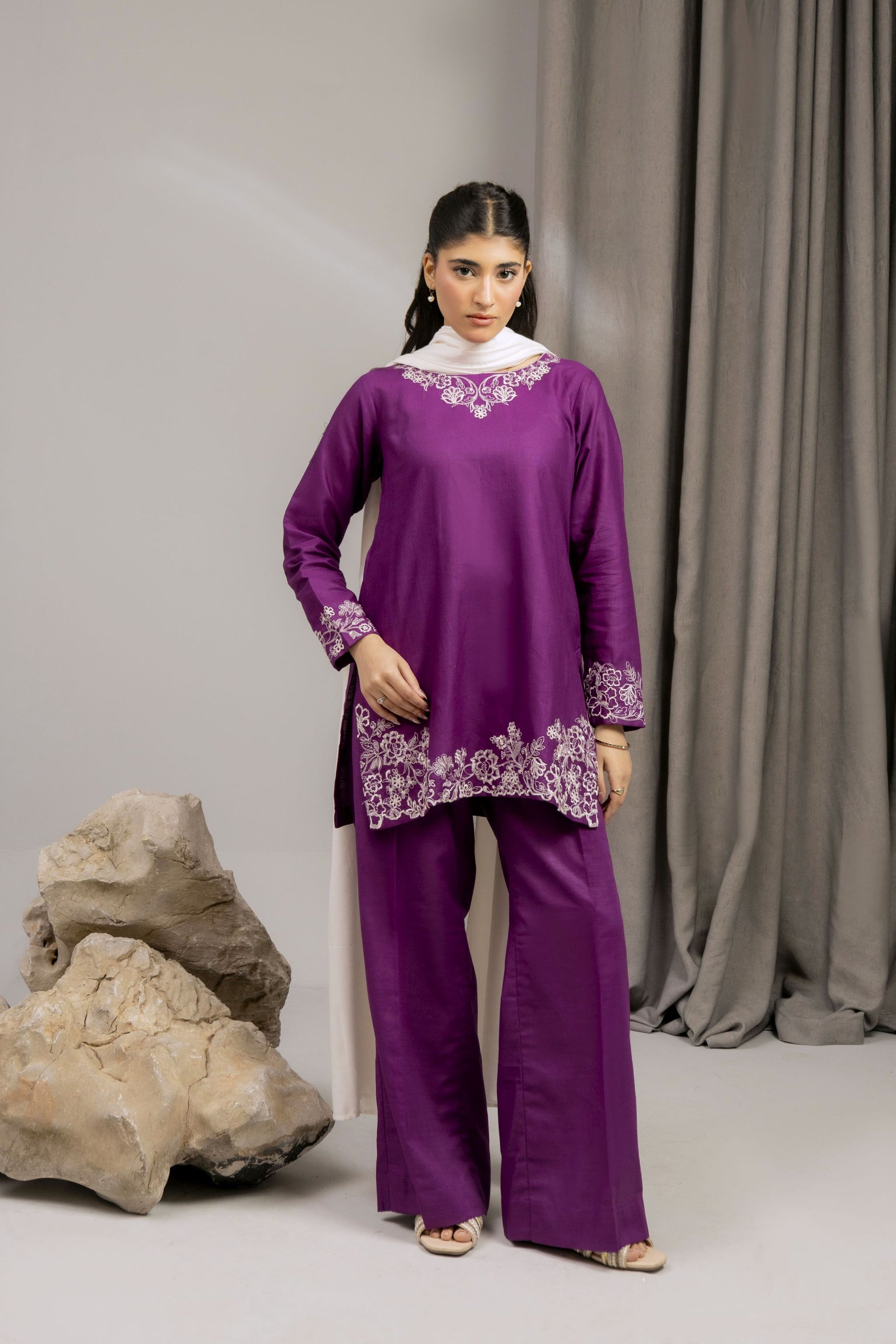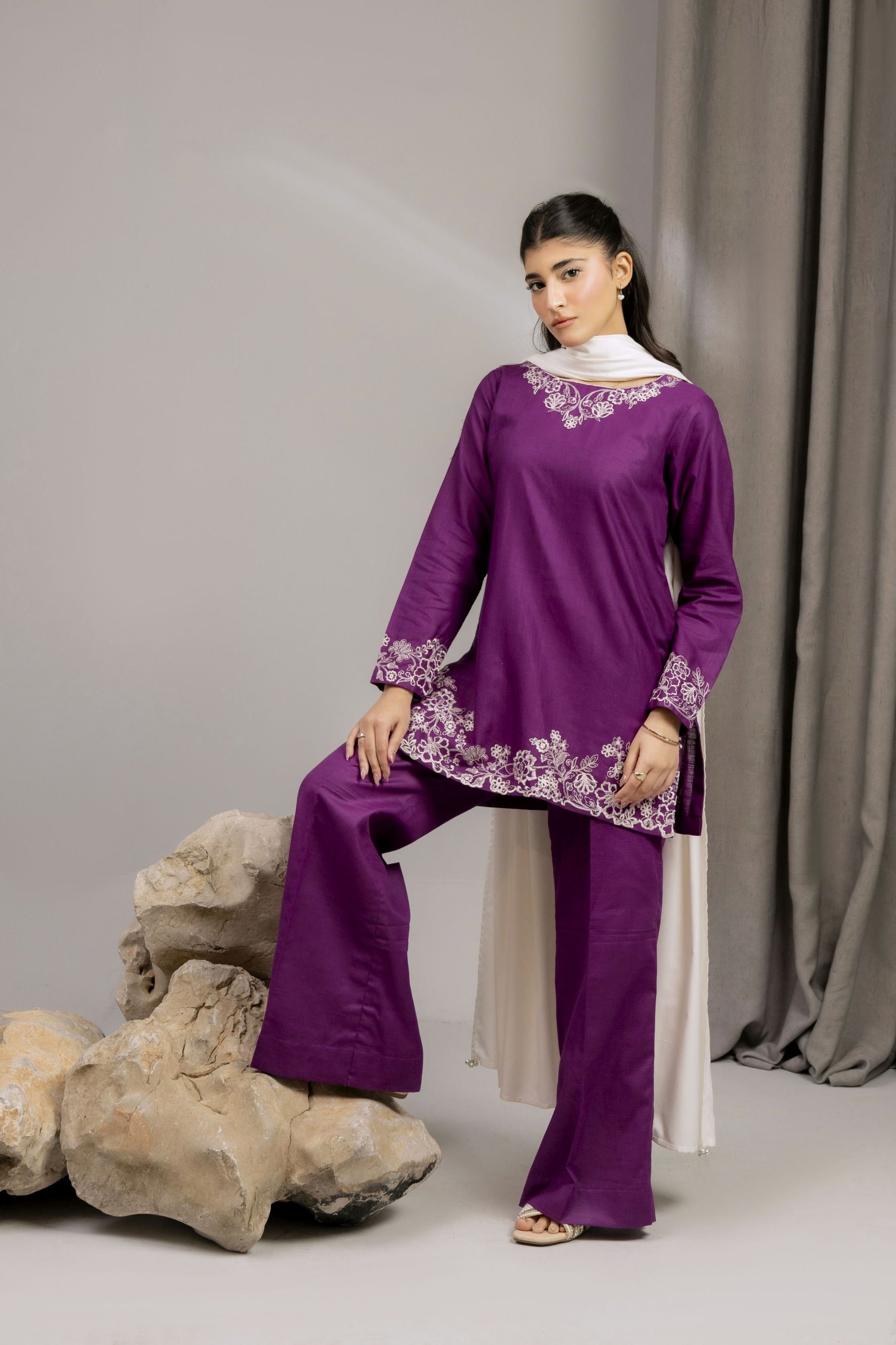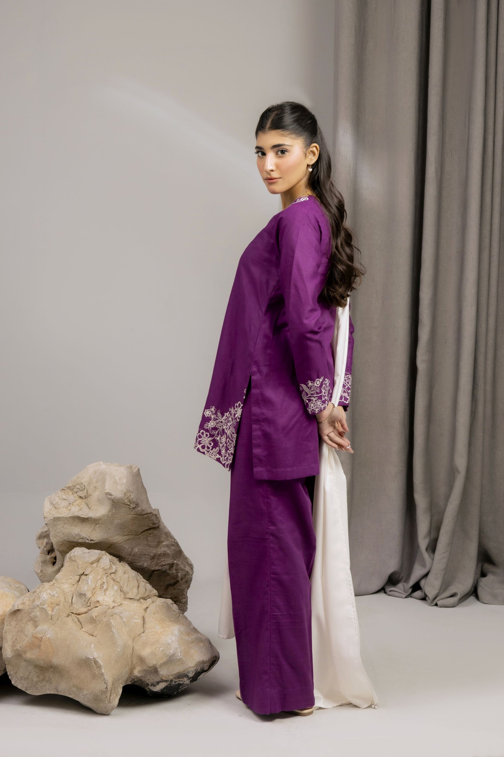 Amara is a vibrant purple khaddar short shirt features delicate white floral embroidery on the neckline, sleeves, and hem for a graceful finish. The ensemble is completed with matching wide-leg trousers and a crisp white shawl, offering a chic and cohesive winter look.