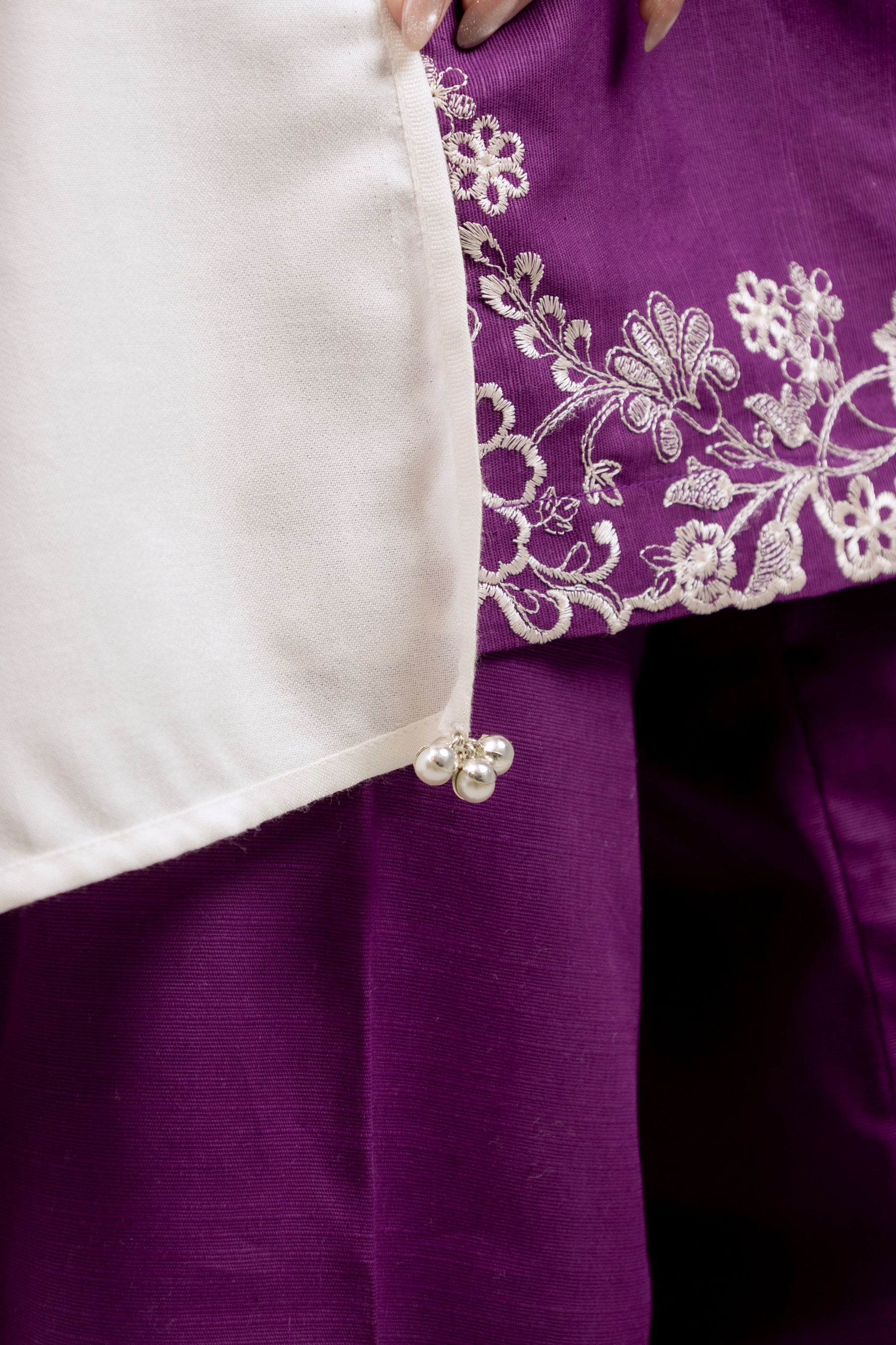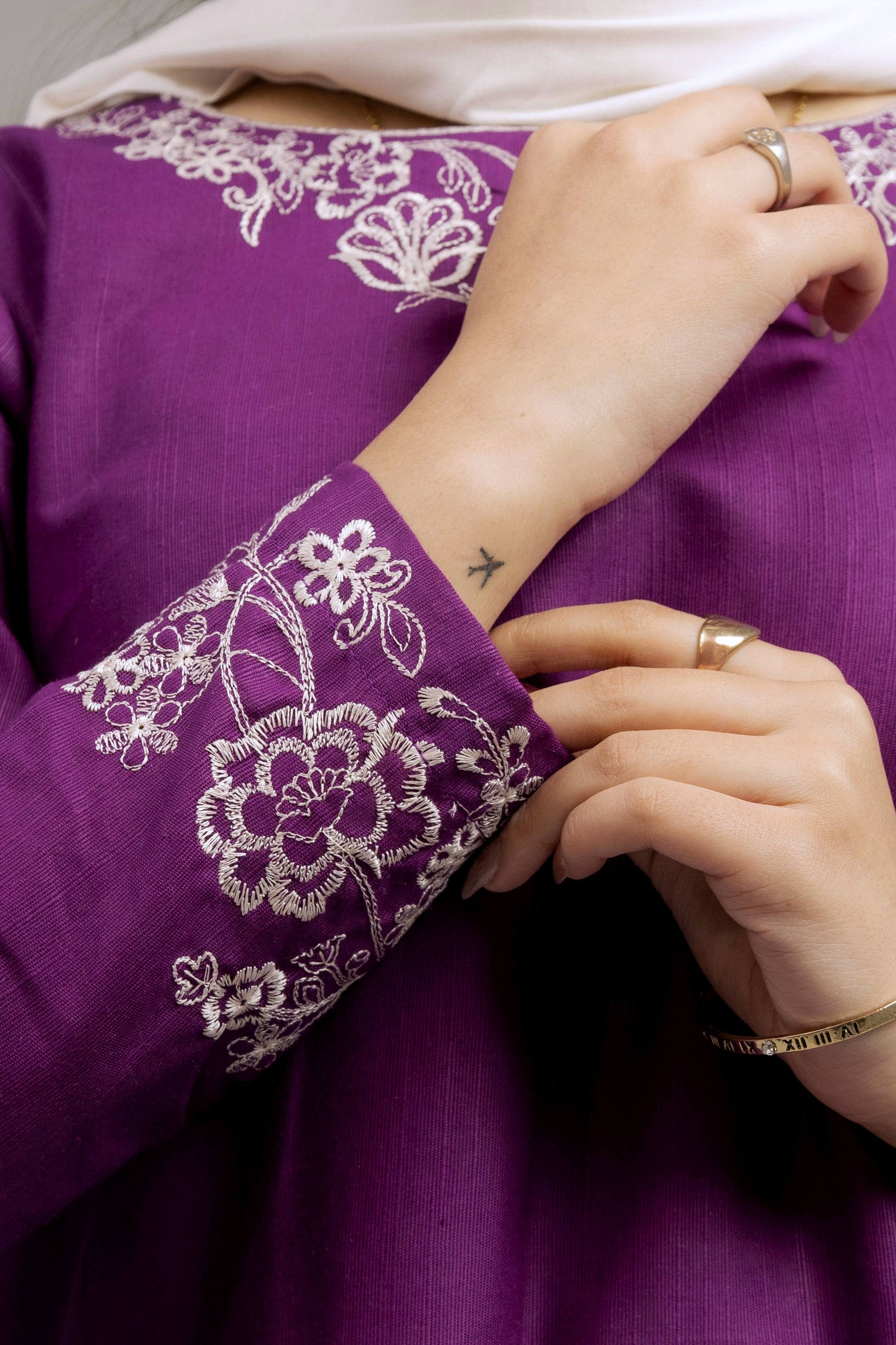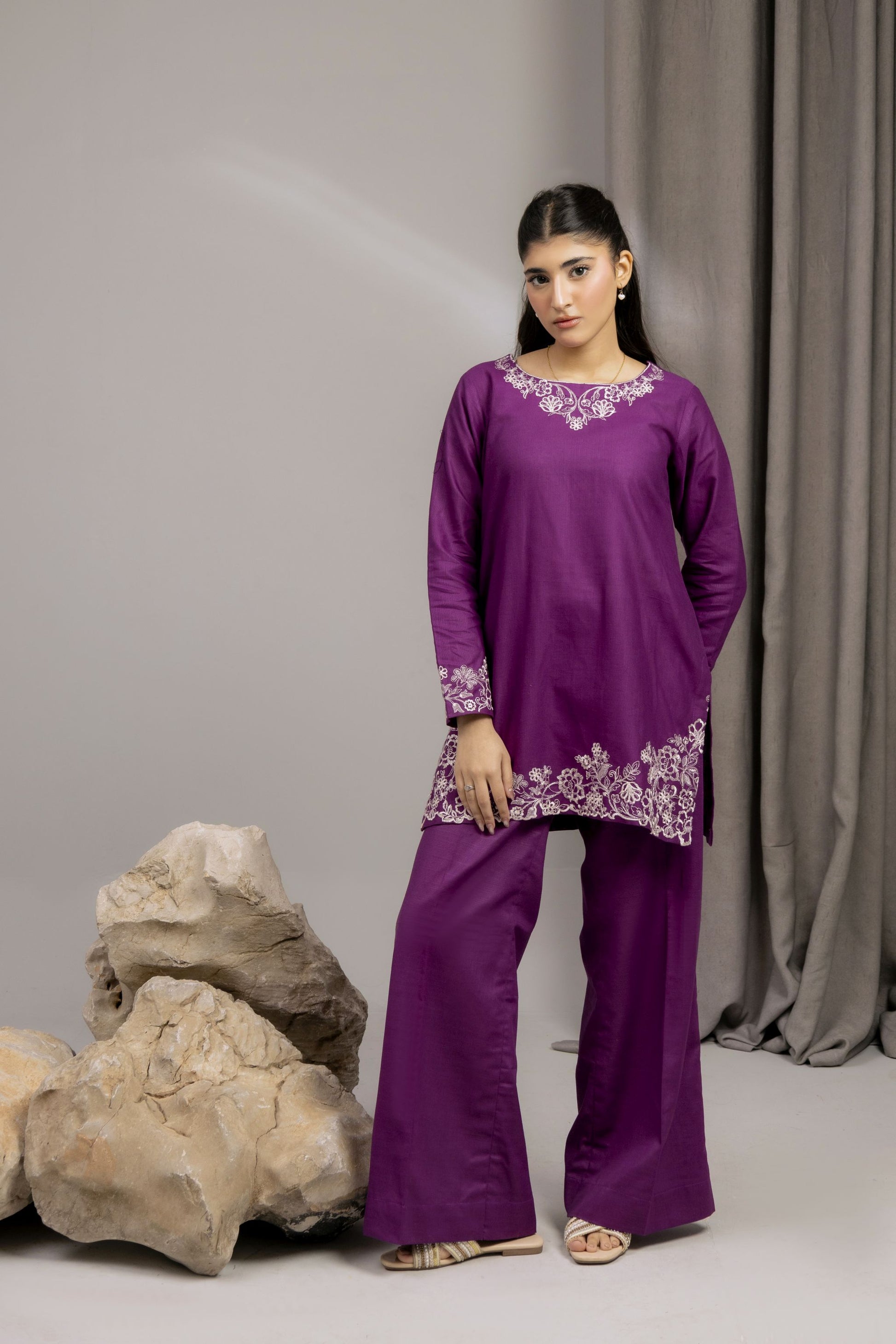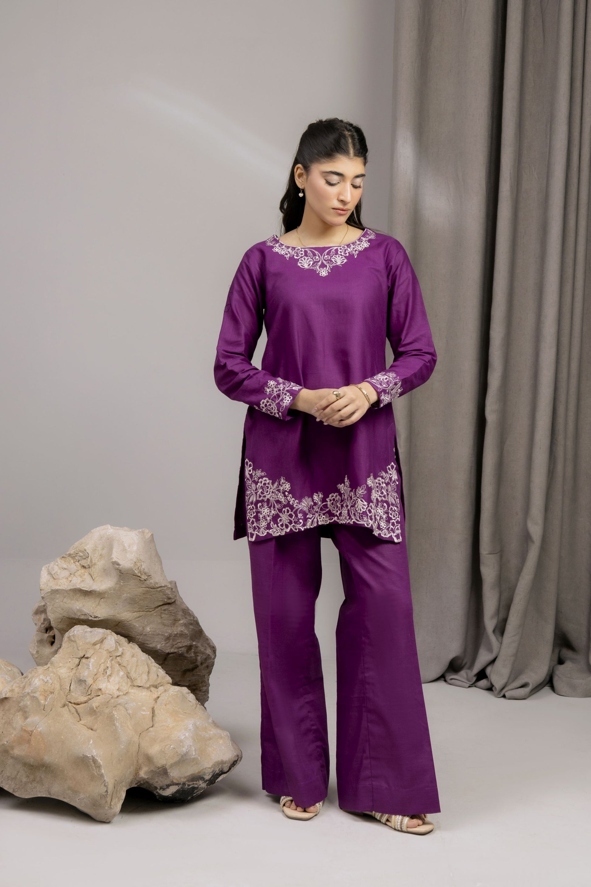 Amara is a vibrant purple khaddar short shirt features delicate white floral embroidery on the neckline, sleeves, and hem for a graceful finish. The ensemble is completed with matching wide-leg trousers and a crisp white shawl, offering a chic and cohesive winter look.
